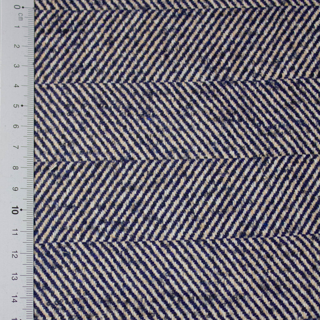 Nina is a blue & beige colored herringbone wool blend fabric that you can use for jackets, coats or skirts. Please note that the herringbone pattern of this fabric goes in the other direction of the fabric which means max length = width of fabric. This is a quality fabric used in the collection of a high-end Italian fashion house.