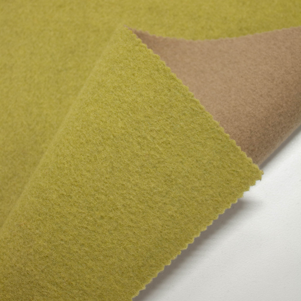 Matys is a camel & pistachio yellow colored wool double face fabric, splittable, ideal for jackets and coats.