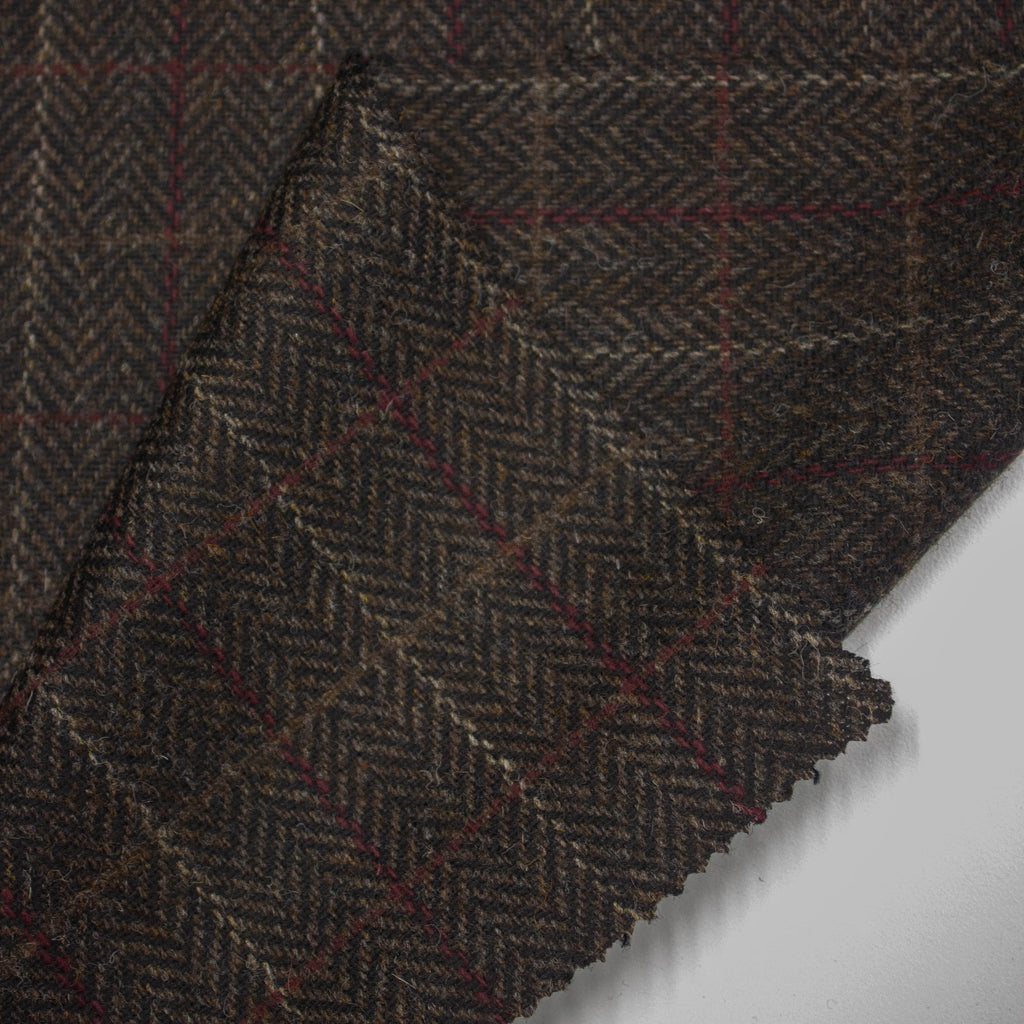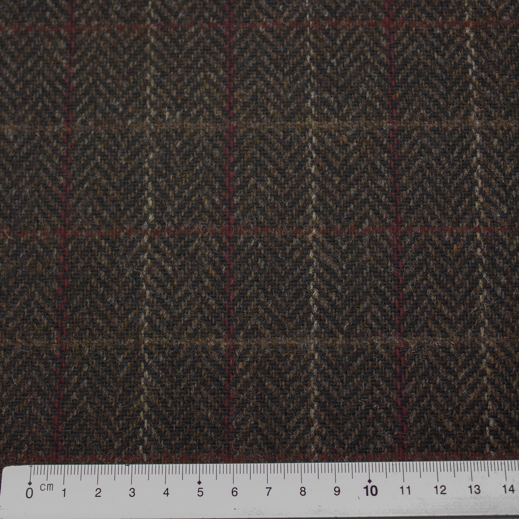 Tony is a brown wool tweed suiting fabric with burgundy check pattern. This fabric can be used for trousers, blazers, skirts or dresses.