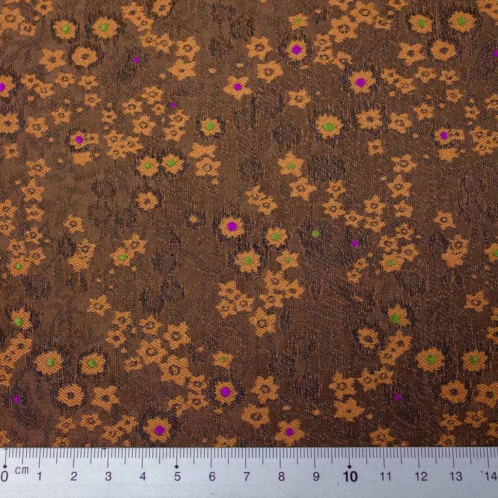 Vik is a copper brown polyester jacquard fabric with floral design. This fabric can be used for jackets, dresses, skirts, structured tops and trousers.