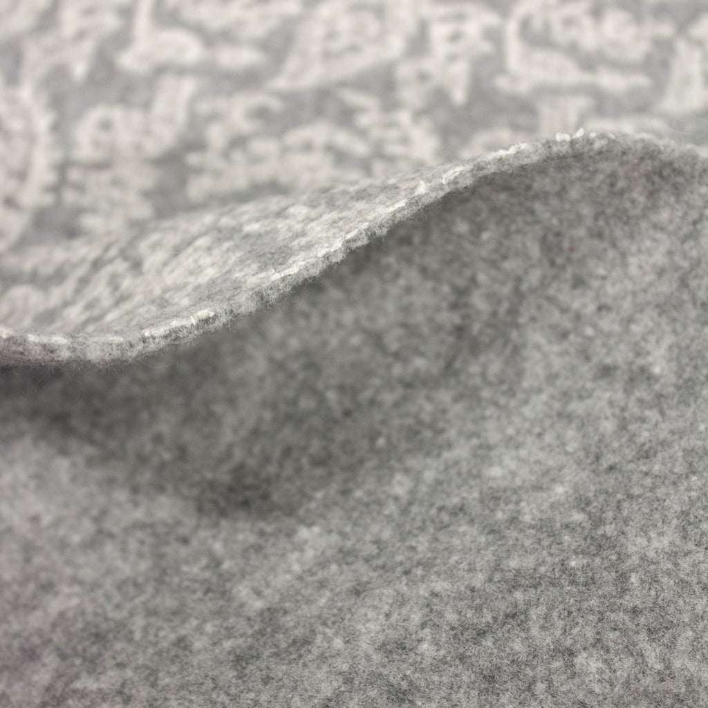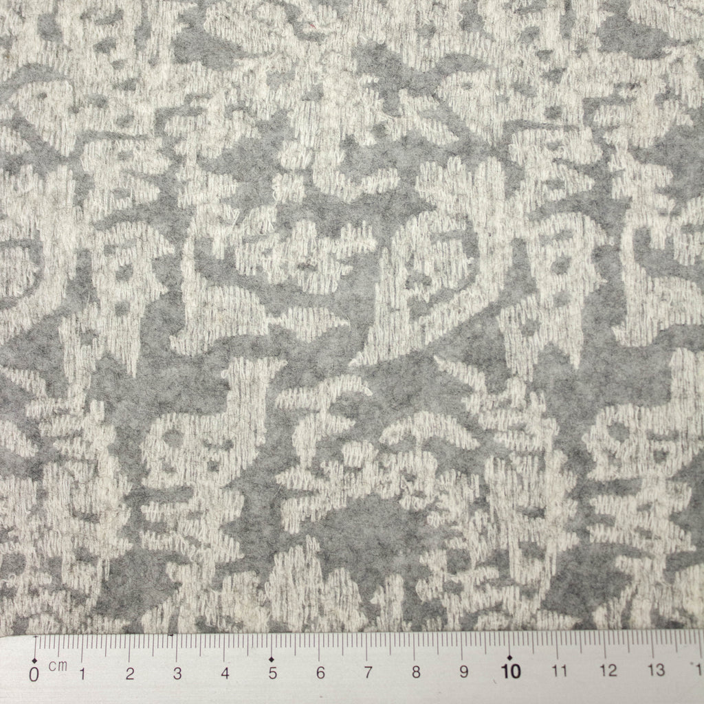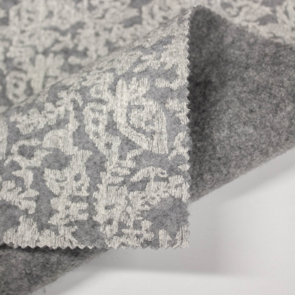 Yill is a grey colored felt wool fabric with ecru embroidered floral pattern. It's a more sturdy wool fabric which will create stunning structured coats and jackets.