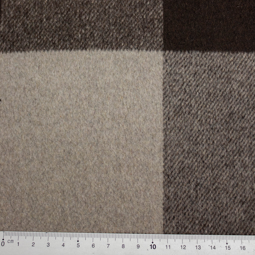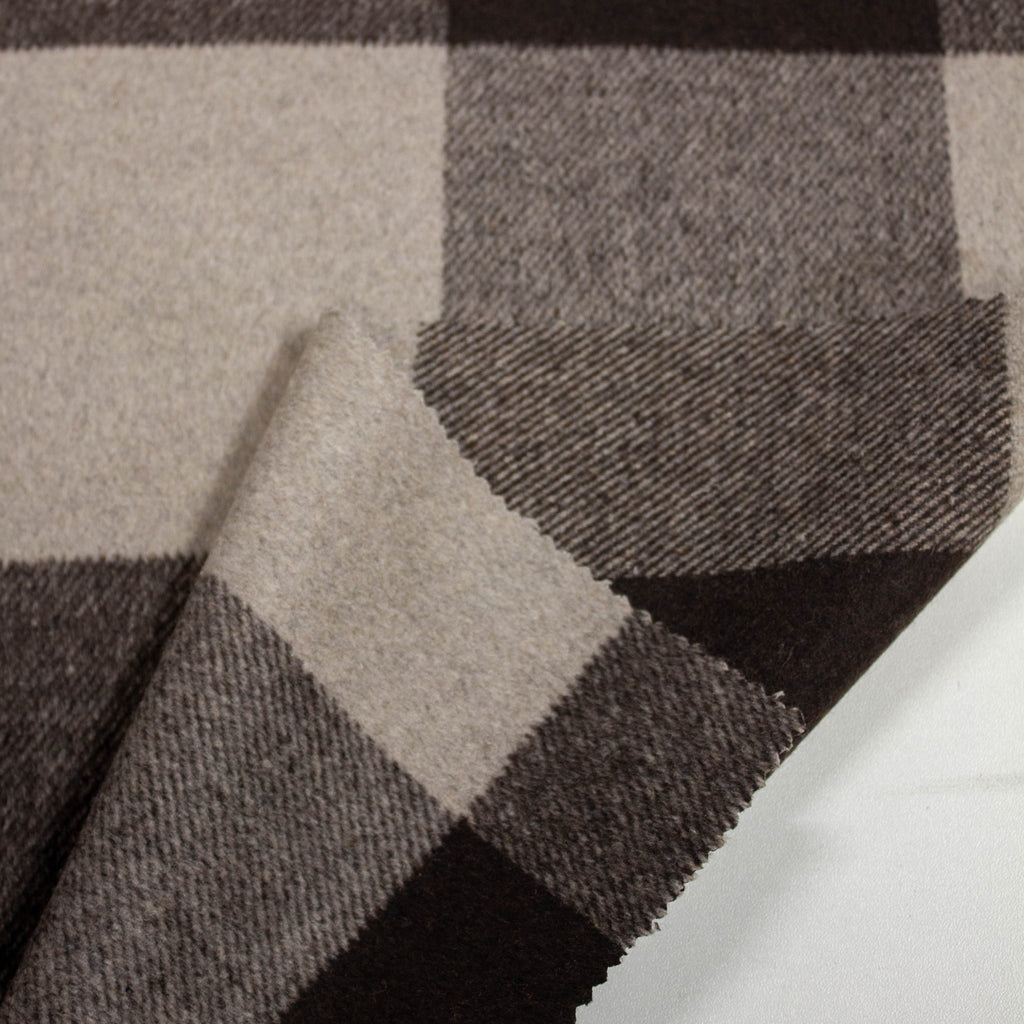 Claire is a wool blend fabric with larger brown & taupe beige colored check pattern. This fabric can be used for jackets, coats or winter skirts & dresses. This fabric is produced in Italy by REDA.