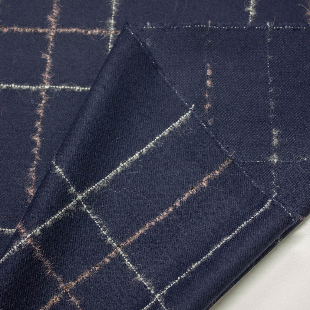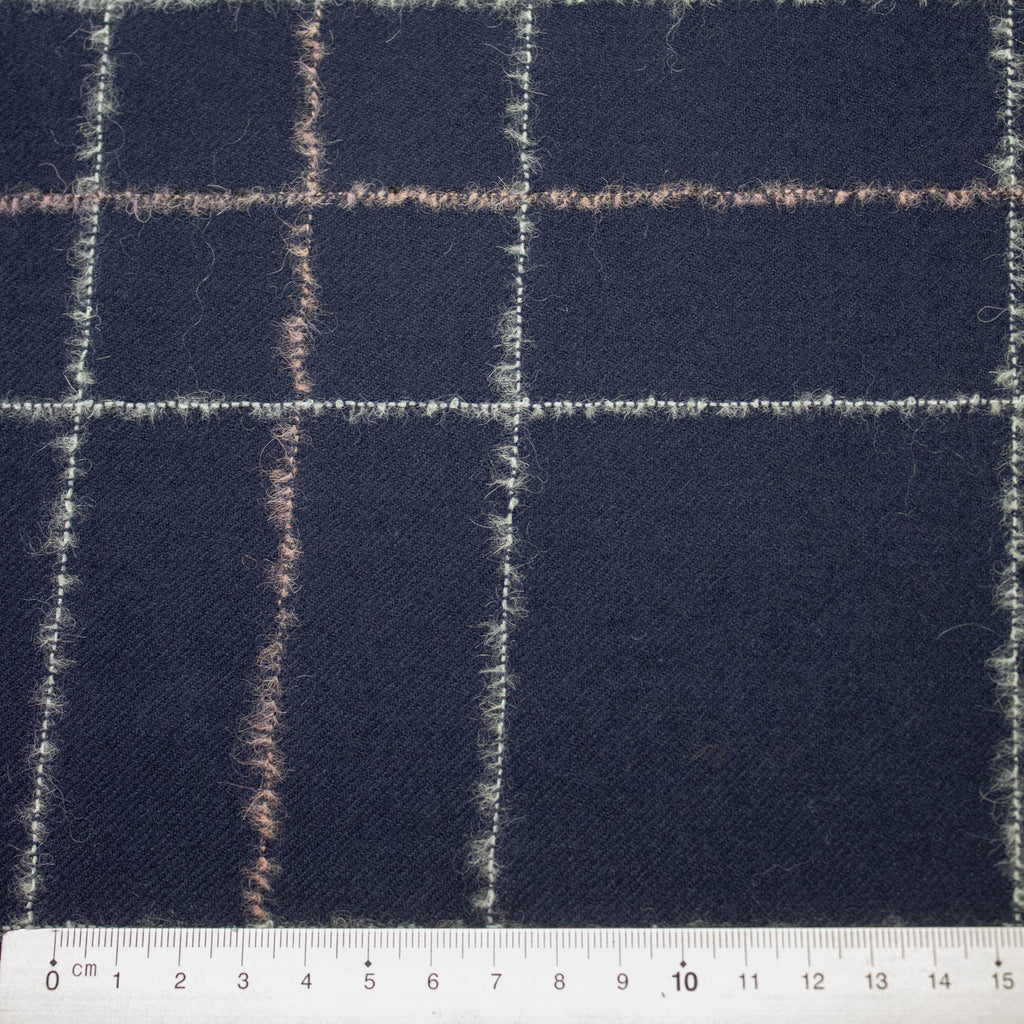 Jitte is a beautiful twill woven wool fabric in navy blue finished with a white & pink "fluffy" check pattern. This fabric can be used for blazers, skirts, dresses, trousers or jackets.