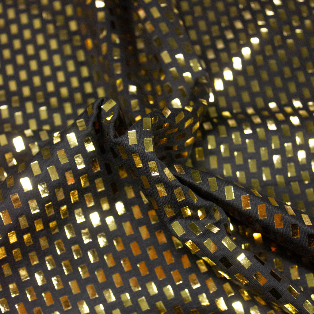Lucy is a black cotton viscose fabric with golden rectangles added to the fabric to give it a festive look. This fabric can be used for tops, blouses, dresses or skirts.