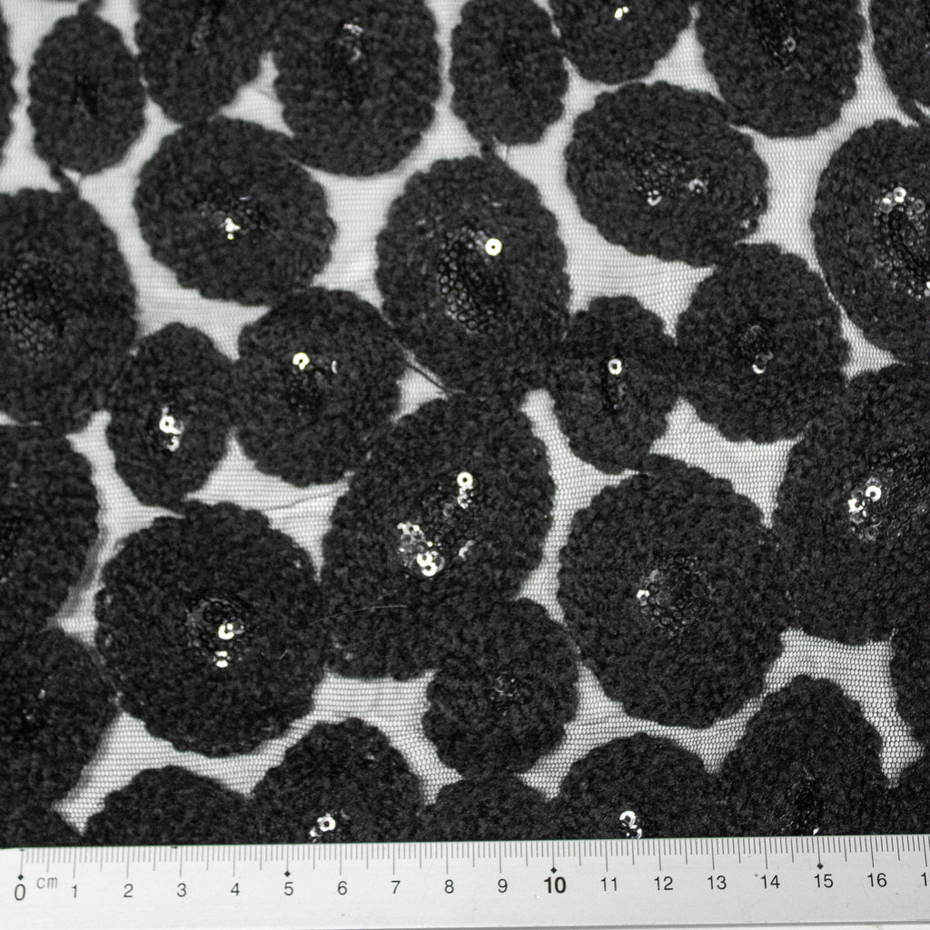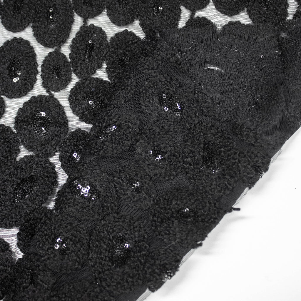 Meran is a black polyester tulle stretch fabric with embroidery, finished with black sequins to give the fabric also a sparking look. This fabric can be used for tops, blouses, dresses and skirts.