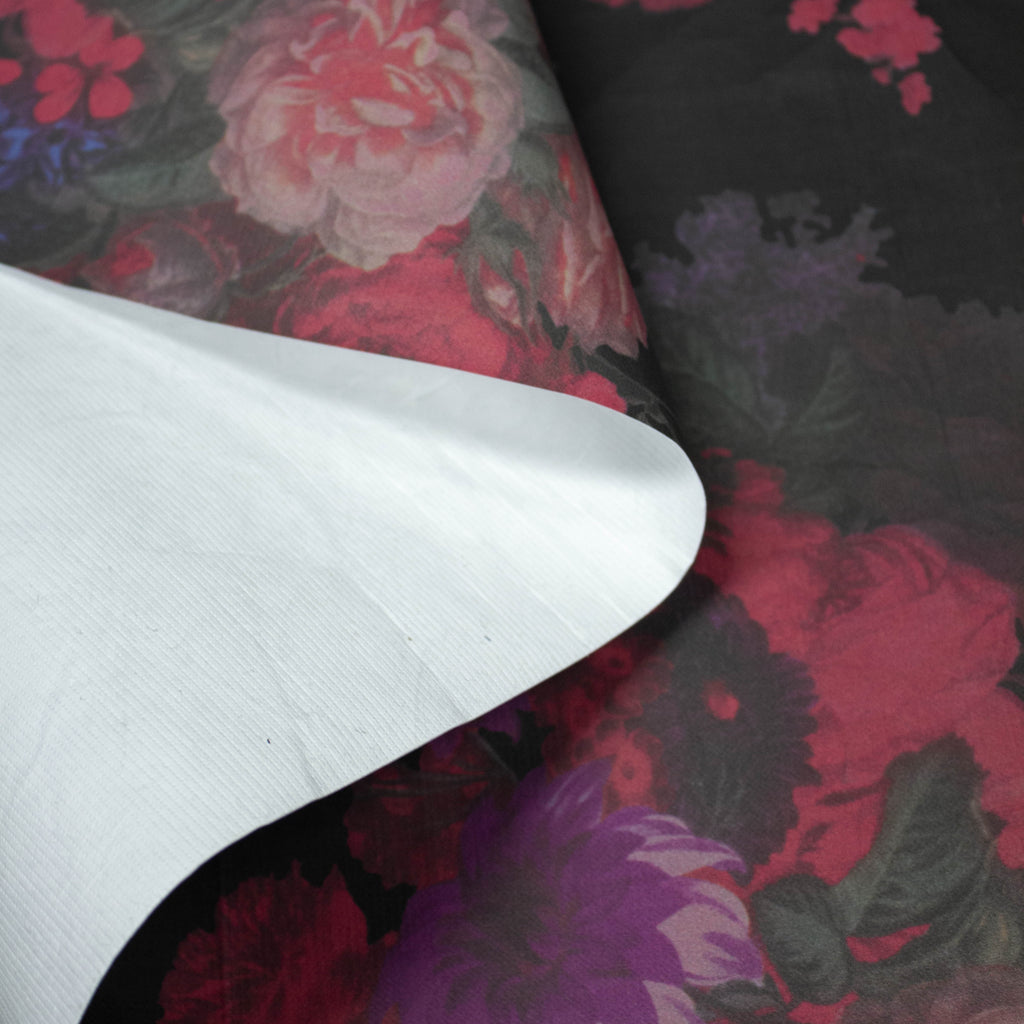 Yema is a burgundy colored tyvek fabric with floral pattern. Tyvek is a 100% synthetic material made from high-density spunbound polyethylene fibers. Lightweight, durable and breathable, yet resistant to water, abrasion, bacterial penetration and aging. This fabric with crispy sound can be used for structured garments.
